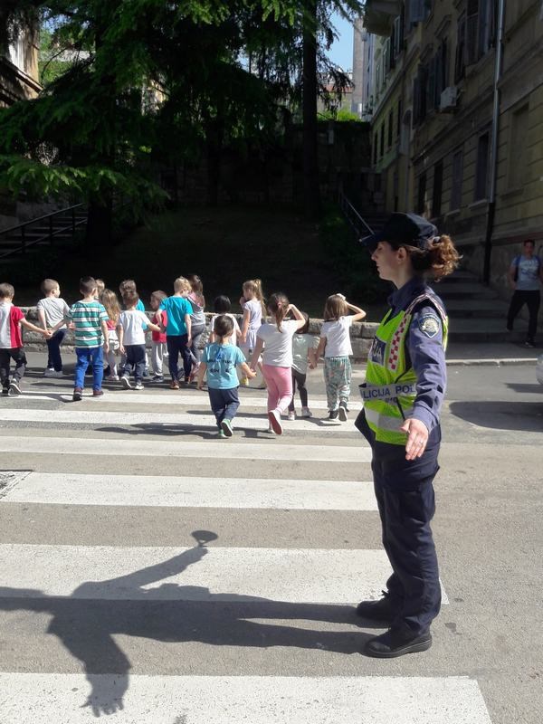 Kao i veljači, s predškolcima i njihovim odgajateljicama jučer se družila i educirala ih Petra Bosilj, policijska službenica iz Službe za sigurnost cestovnog prometa ove Policijske uprave. Na samom početku ponovili su već naučeno gradivo, odnosno osnovne prometne pojmove kao što su cesta, nogostup, semafor, kako se sigurno kretati u prometu kao pješak i slično. Potom su svi zajedno izišli ispred vrtića gdje je policijska službenica regulirala promet, a djeca su vježbala siguran prelazak preko pješačkog prijelaza.